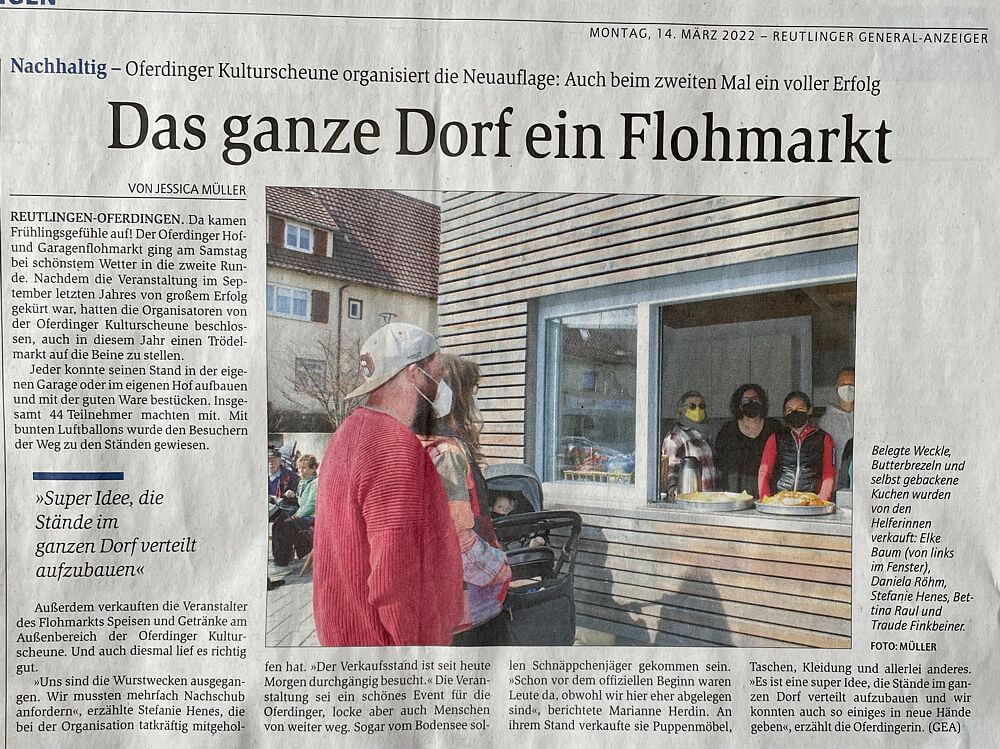 "Das ganze Dorf ein Flohmarkt" - so betitelte der GEA (Reutlinger Generalanzeiger) in seiner Ausgabe vom Montag, 14. März 2022 den Bericht über unseren zweiten Hof- und Garagenflohmarkt, der am Samstag, 12. März 2022 in Oferdingen stattfand.